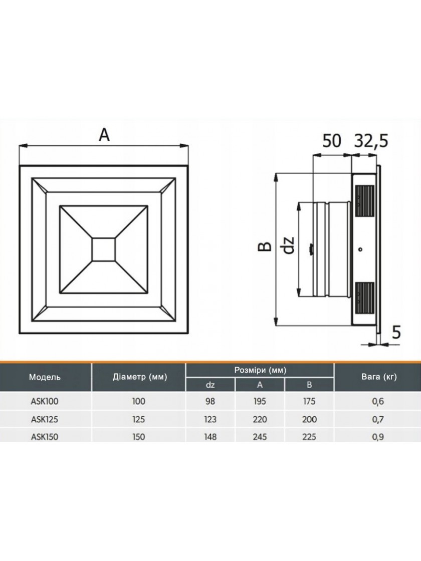 Квадратний анемостат ASK fi 150 – це естетичне завершення витяжних вентиляційних отворів.