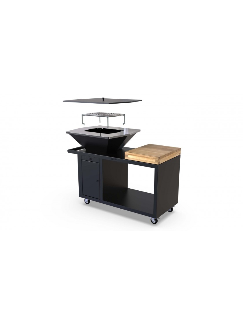 В комплект входить основа, корпус, тумба, дерев'яна поверхня, поверхня для приготування їжі та для зручності коліщата для переміщення прикріплені до основи.