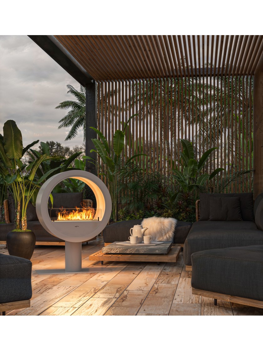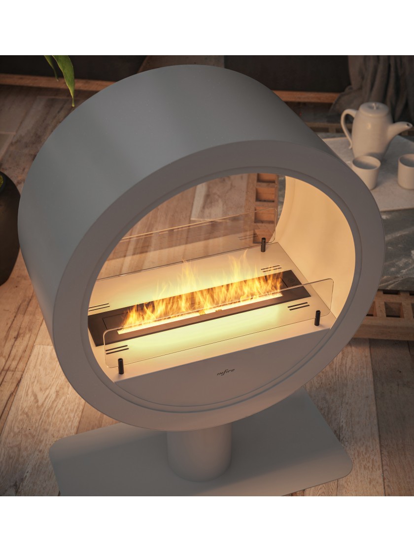 Окремо стоячий біокамін INCYRCLE — це сучасне рішення, яке дозволяє встановити камін у будь-якому місці завдяки його мобільності та незалежності від вентиляційних систем. Він має характерний блок на круглій ніжці загальною висотою 100 см, що робить його ідеальним для інтеграції в сучасні промислові простори.