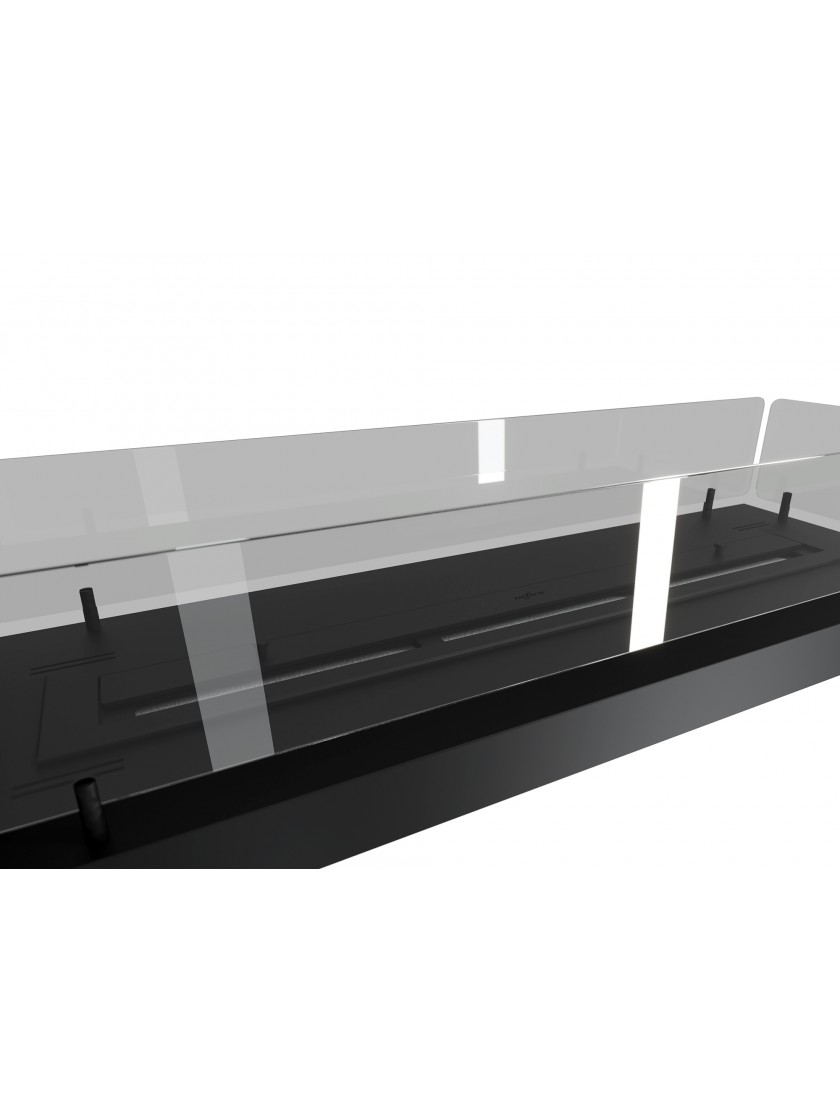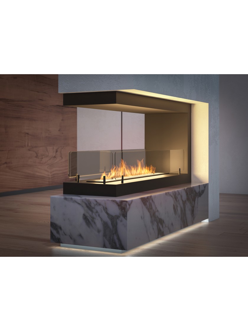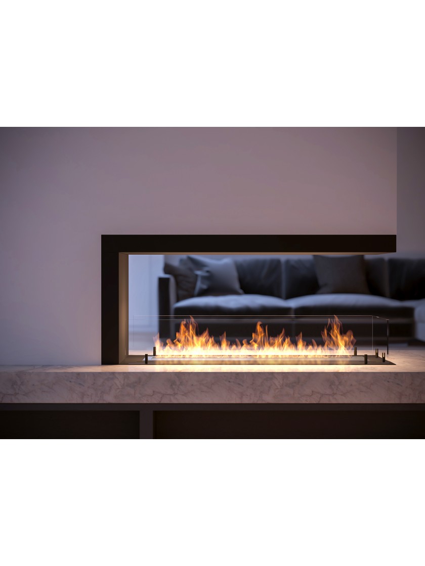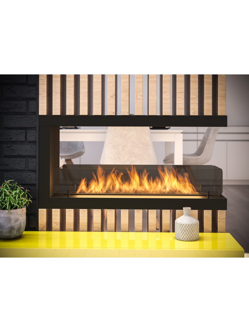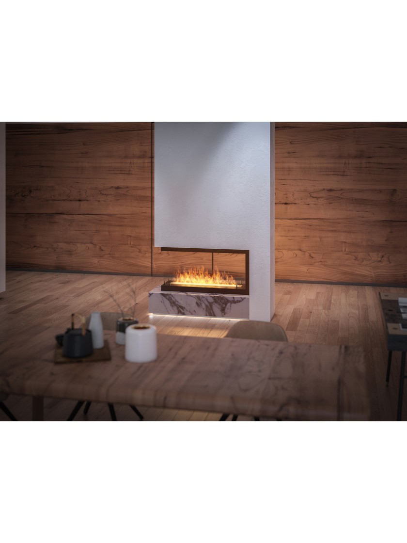 Модель INSIDE U 1000.2 - це камін, який встановлюється в підготовлену нішу. Це найбільш широка доступна вбудована модель. Каркас каміна оснащений вентиляційною системою, яка запобігає створенню тиску під пальником у разі переливу палива; також має вбудований утеплювач, що дозволяє безпечно монтувати його, наприклад, в будівлі з МДФ або гіпсокартону. Рама має 3 скла, засунуті в спеціальні рейки, що дозволяє приховати всі кріплення. Камін може бути красивим і ефективним сполучником між двома кімнатами.