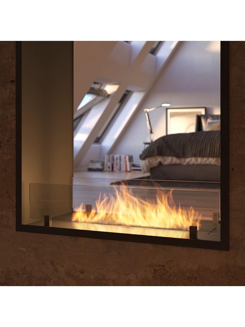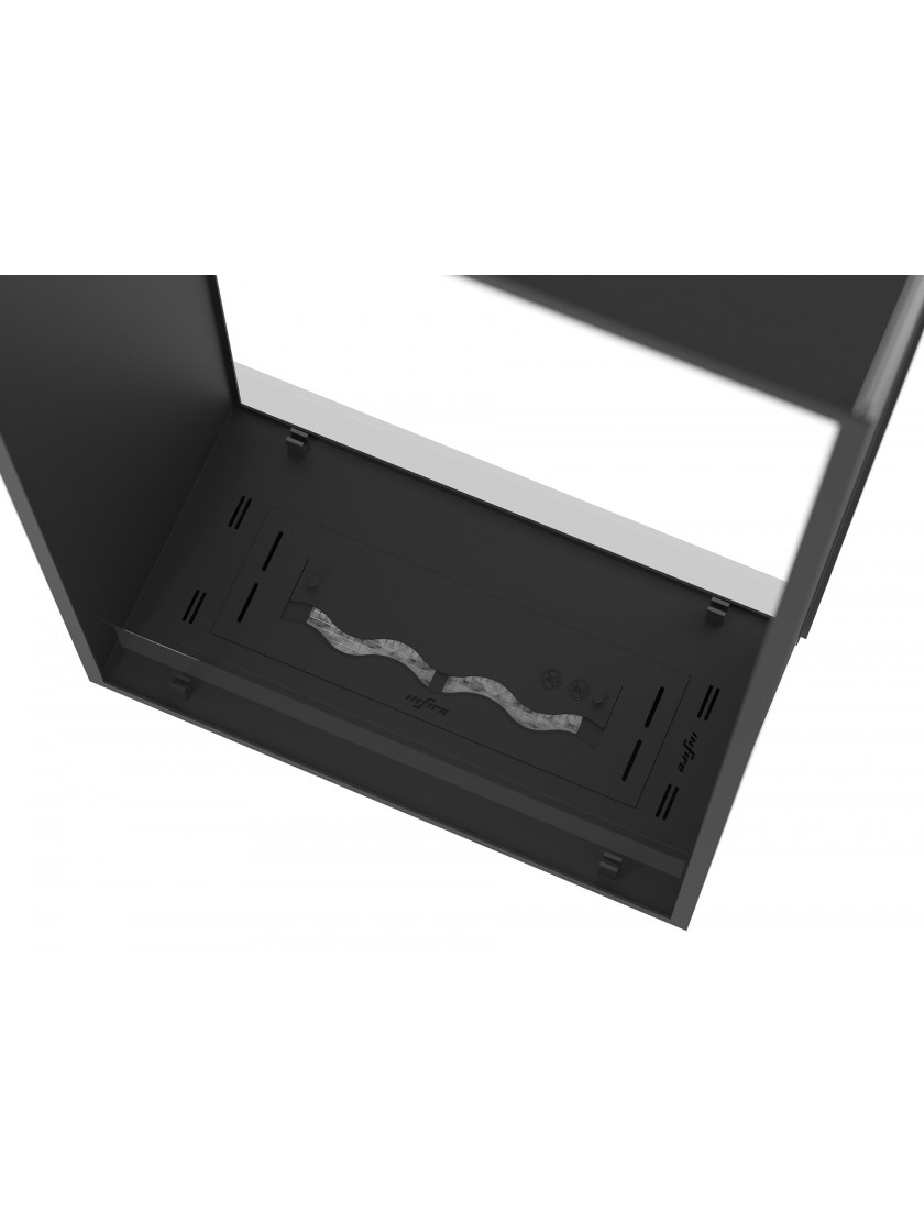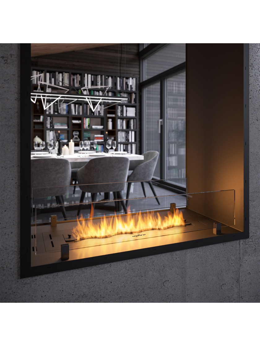 Вставка з керамічного волокна з сіткою підвищує безпеку, продовжує та оптимізує процес горіння. Розсувна планка дозволяє регулювати розмір полум'я і безпечно гасити камін, а форма хвилі створює додатковий 3D ефект. Також пальник має систему вентиляції, яка запобігає створенню тиску під пальником у разі переповнення палива. Додатковий резервуар під пальником гарантує більшу безпеку в разі витоку палива за межі пальника.