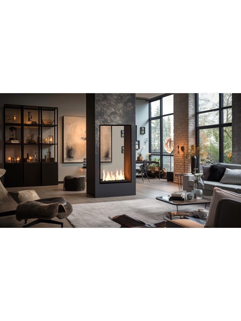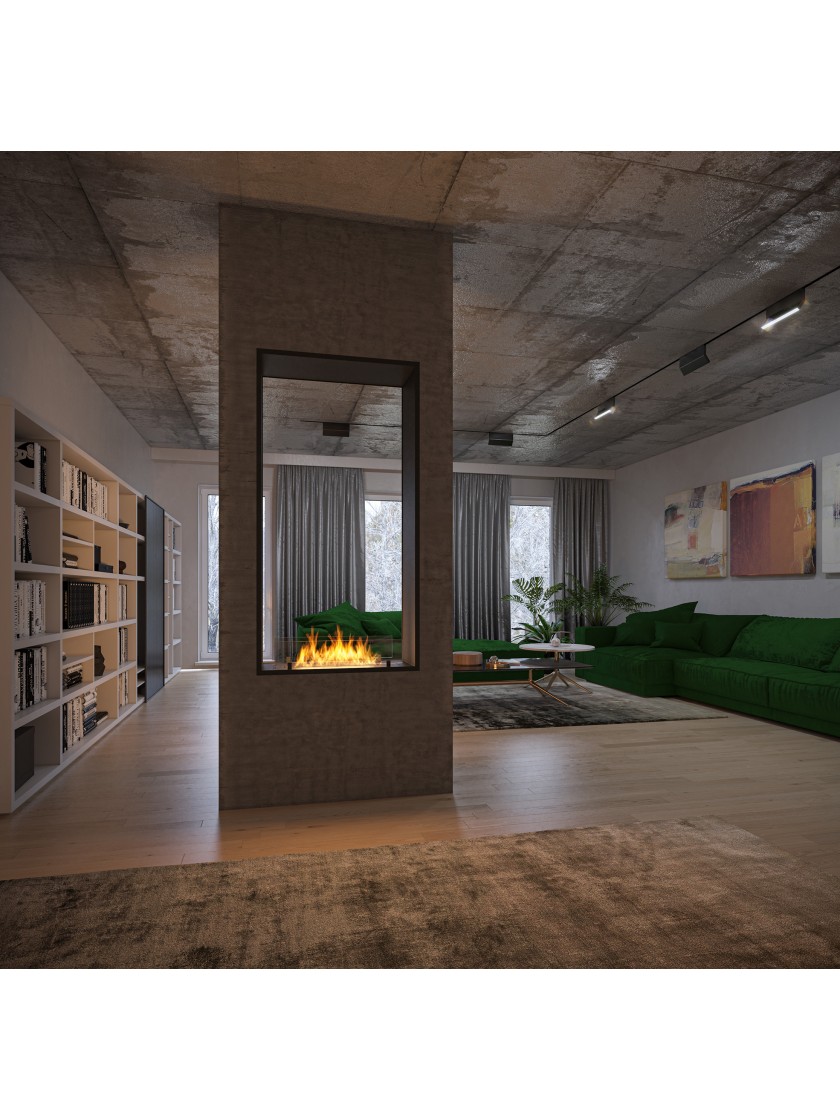 Модель 2 Side 1600 SLIM/vert призначена для встановлення в стіні між двома кімнатами. Біокамін має власну систему повітрозабору, що запобігає виникненню тиску під пальником, що призводить до переливання палива.