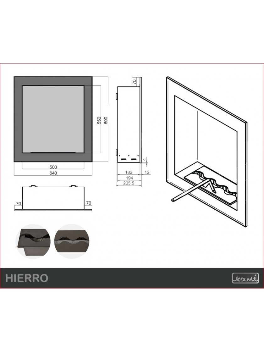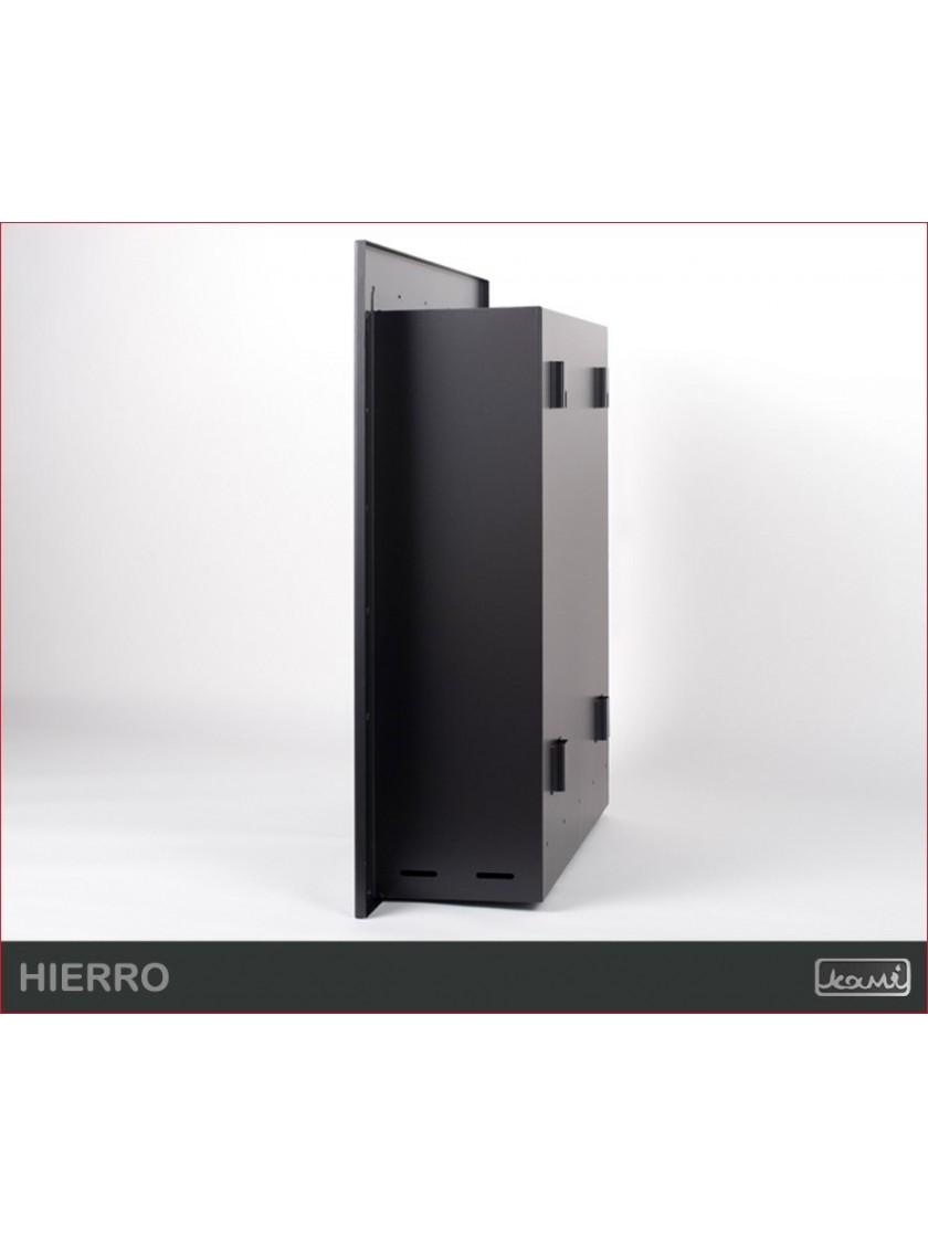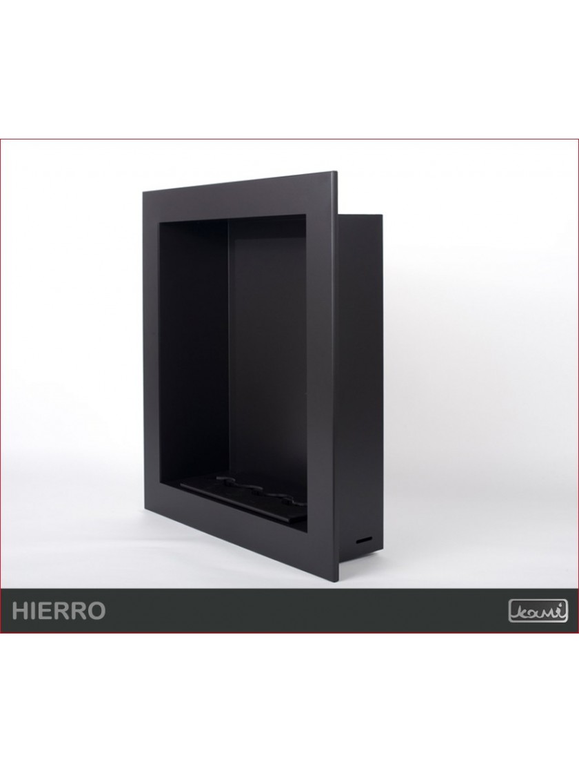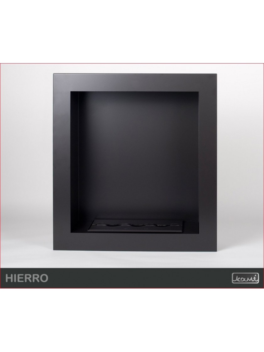 Вбудований біокамін Hierro також можна використовувати як настінний (підвісний) біокамін. Його розміри дозволяють оздобити стіну навіть в невеликих кімнатах. Ви можете вибрати вставки WAVE або LINE ( чорні або нержавіючі). Типи картриджів описані на окремій сторінці . Конструкція біокаміна виготовлена з листової сталі товщиною 1,5 мм з порошковим покриттям чорного напівматового NON 000. Декоративний елемент покритий сталевою порошковою фарбою також чорного напівматового NON 000.