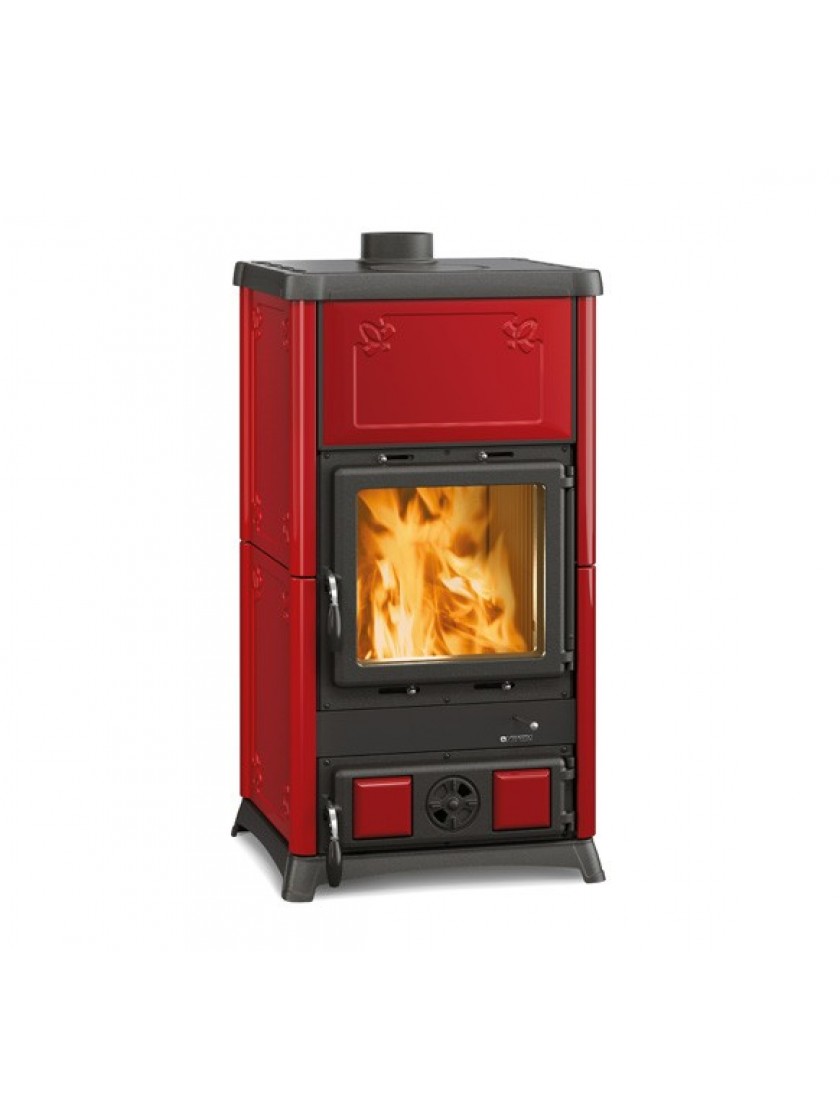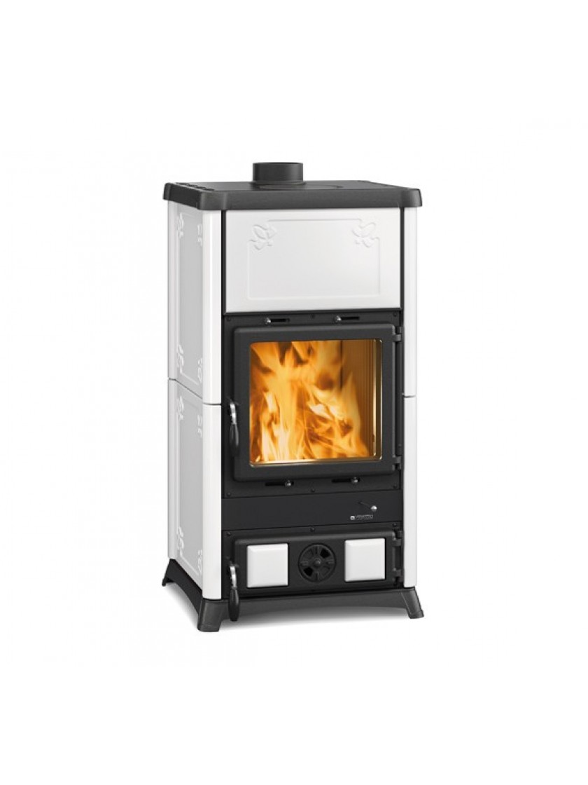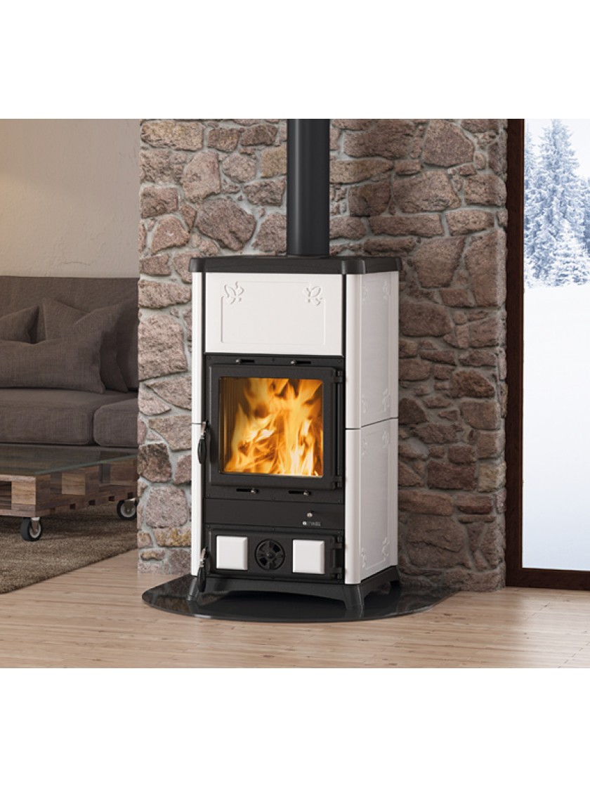 Топкова камера з чавуну із системою додаткового допалу • Зовнішнє облицювання натуральним каменем або майолікою • Дверцята та верхня варильна панель з емальованого чавуну • Склокераміка, стійка до високих температур до +750° • Скринька для завантаження дров.