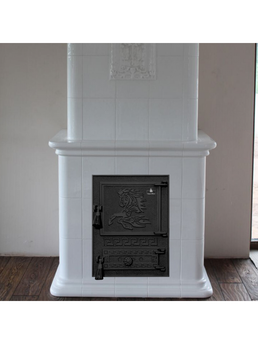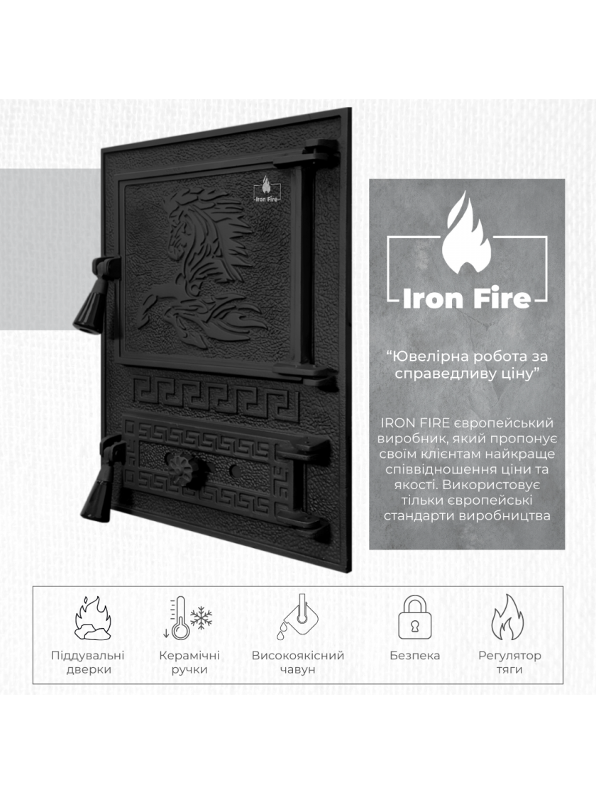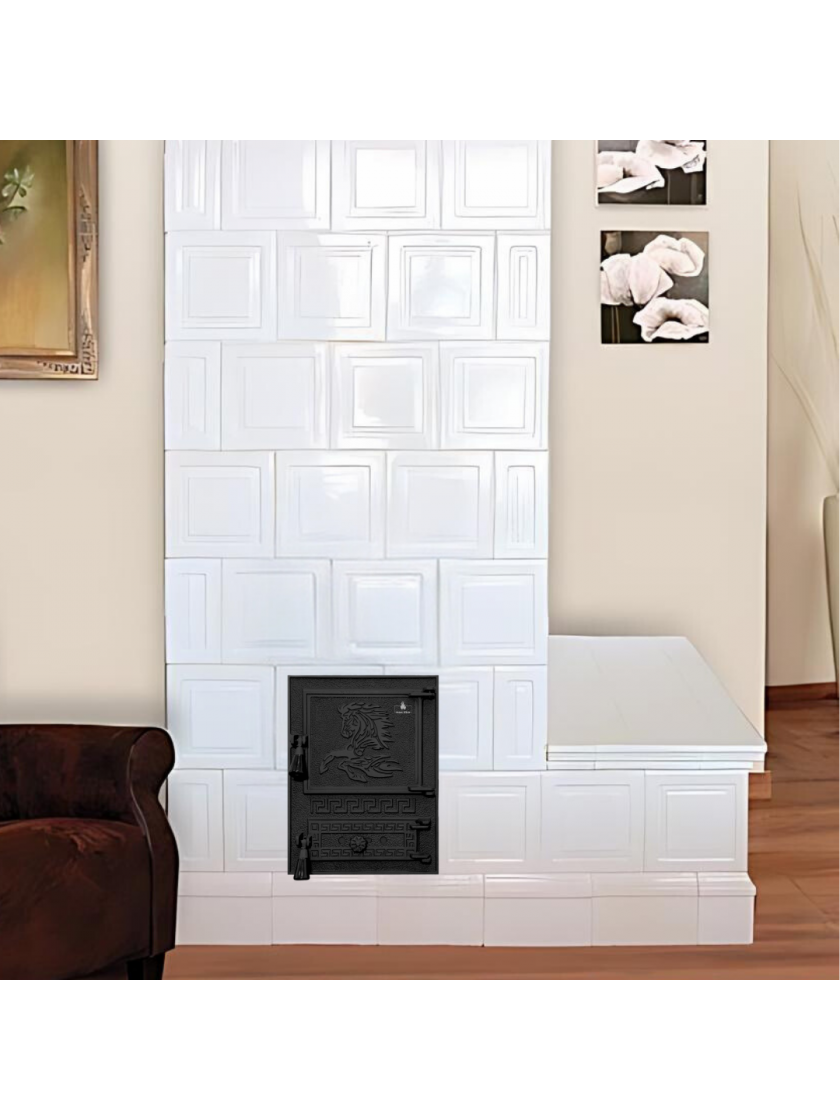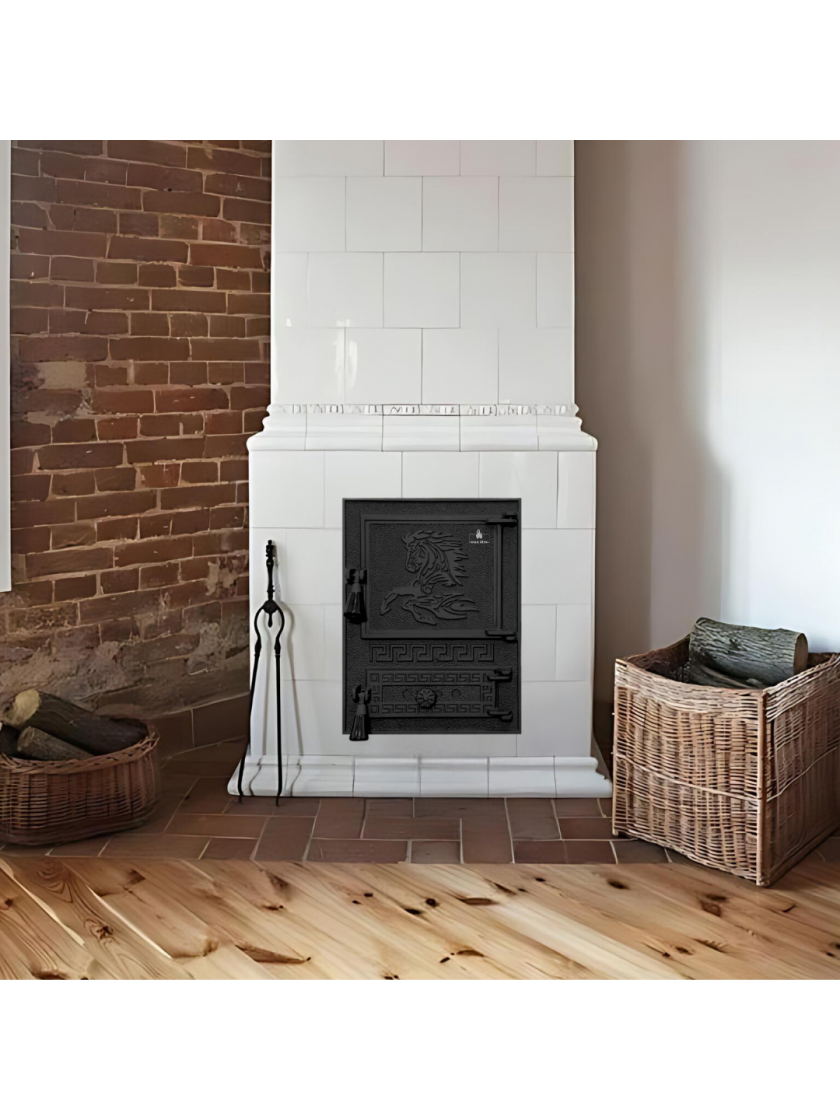 - Високоякісний чавун: дверцята швидко нагріваються і довго зберігають тепло після згасання вогню, що робить їх більш ефективними порівняно зі сталевими аналогами.