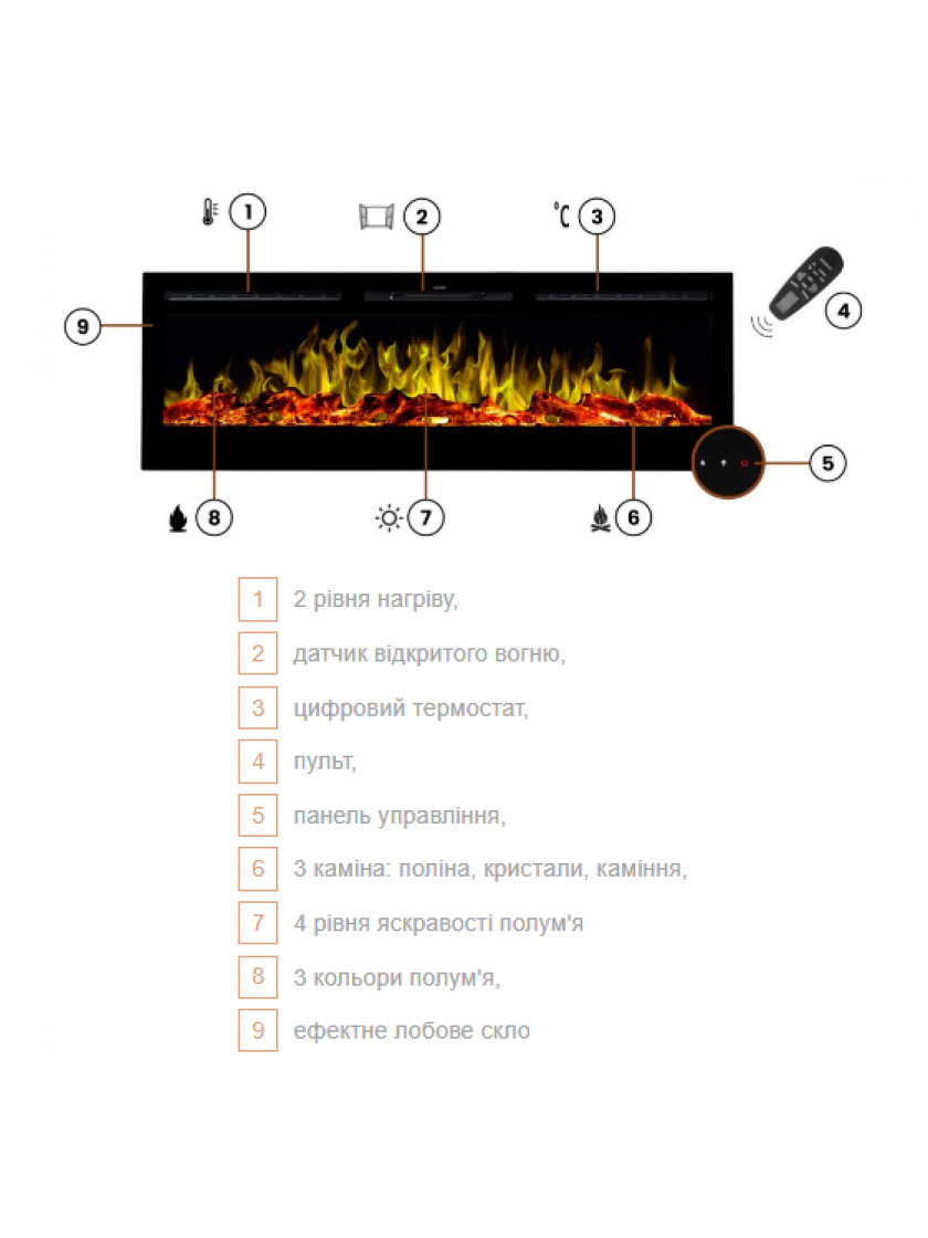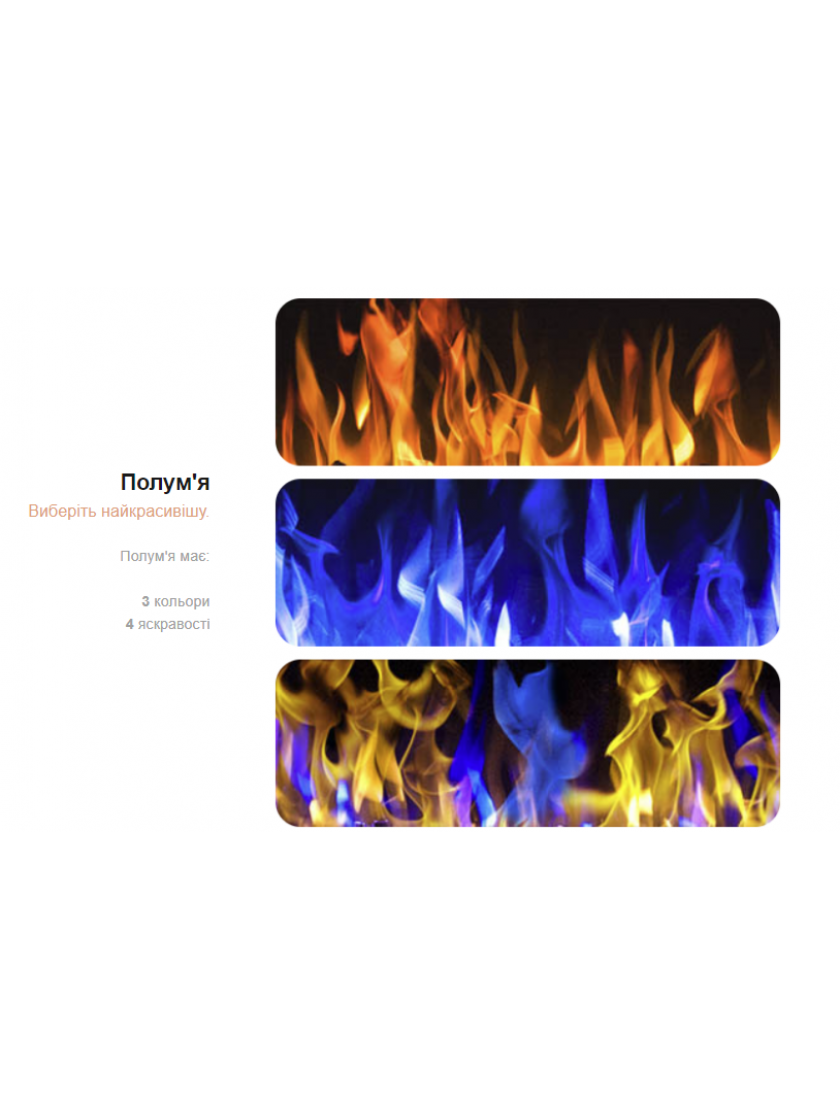 - 3 кольори полум'я, 4 рівні яскравості полум'я, 10 кольорів підсвічування топки, 5 рівнів яскравості топки.