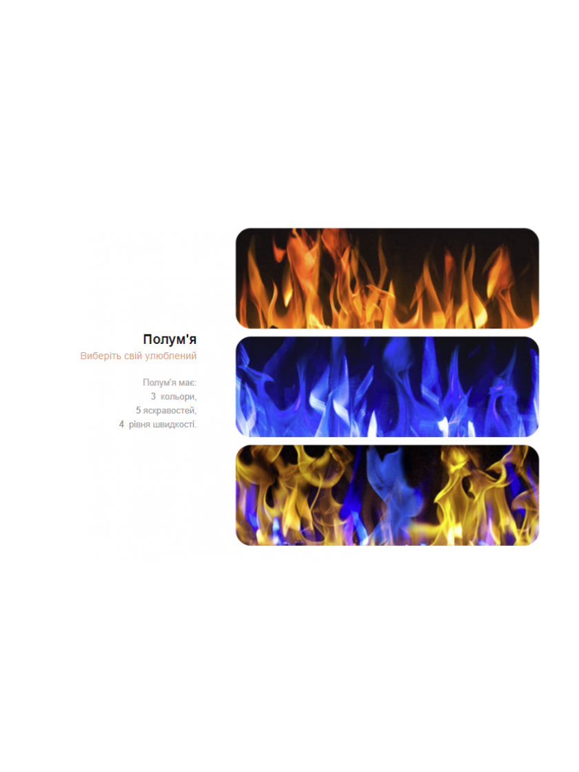 - 3 кольори полум'я, 5 рівнів яскравості полум'я, 4 швидкості полум'я.
