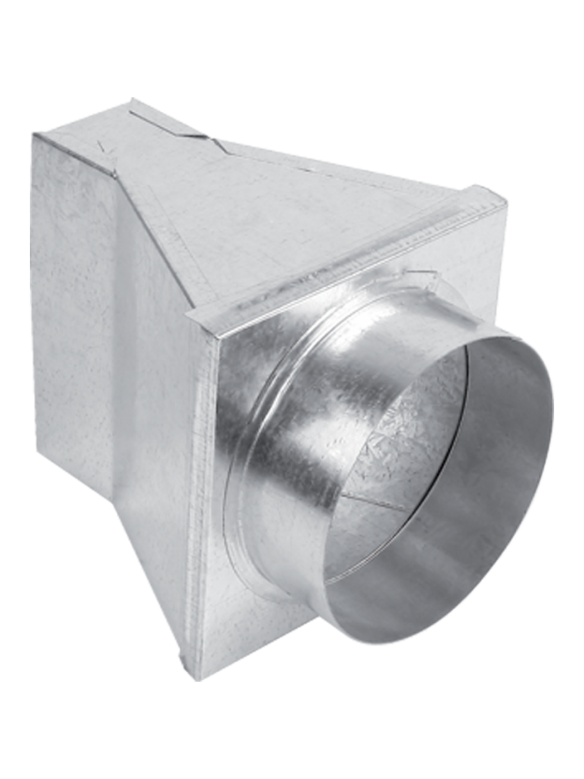 Перехідник з каналу 150х50 мм в трубу діаметром 125 мм під кутом 180°. Може бути також елементом системи розподілу повітря або елементом, який подає холодне повітря під камін.