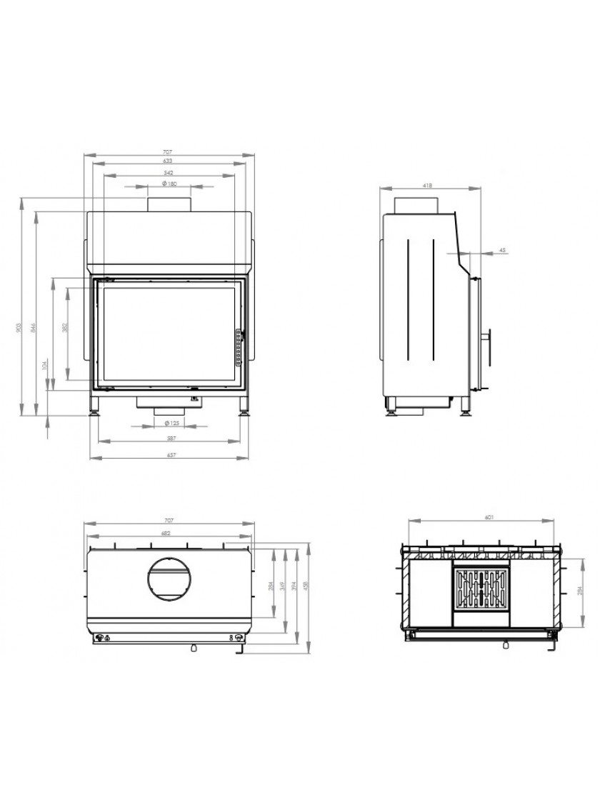 • Завдяки конструктивним особливостям, камінна топка обладнана подачею повітря на скло, що запобігає його потемнінню під час експлуатації;