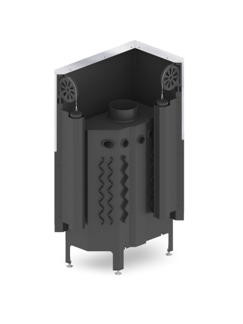 4. Подача повітря у топку здійснюється з вулиці через подвійний повітрозабірник, який не тільки дозволить керувати процесом горіння, а і створить повітряну завісу, яка очищатиме скло.
