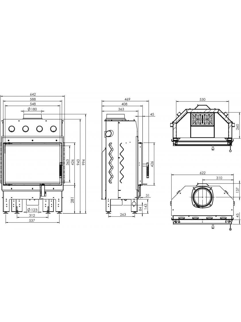- Завдяки конструктивним особливостям, камінна топка обладнана подачею повітря на скло, що запобігає його потемнінню під час експлуатації;