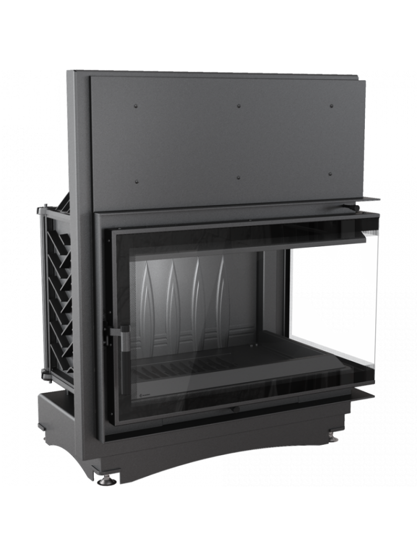 Камінна топка з двома скляними панелями, зіставленими одна навпроти одної під прямим кутом (скляні панелі з'єднано без рами).