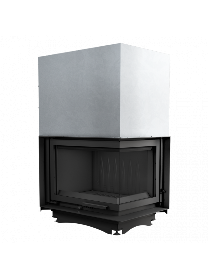 Камінна топка з двома скляними панелями, зіставленими одна навпроти одної під прямим кутом (скляні панелі з'єднано без рами).