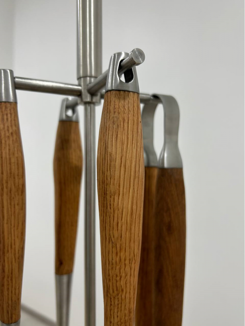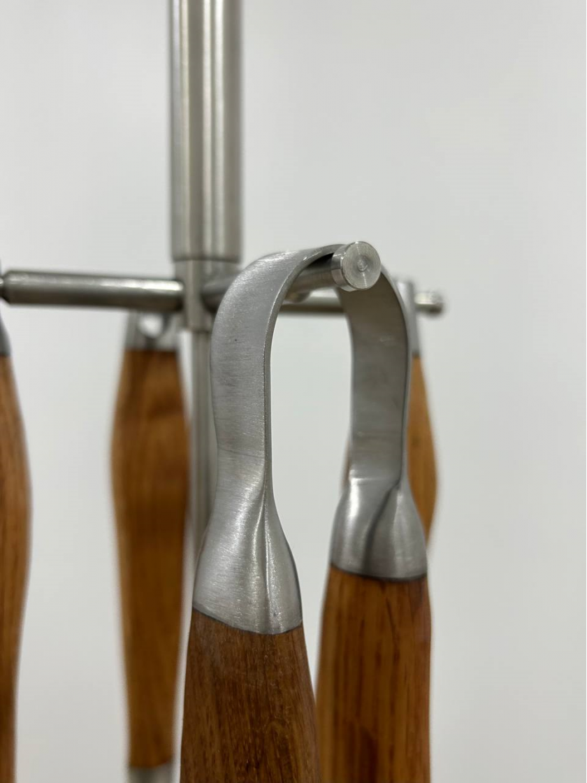 Набір інструментів з нержавіючої сталі призначений для тих, хто любить інновації. Інструменти зроблені з високою точністю. Їхня м'яка форма кидається у очі і не залишає ніяких сумнівів. Чудове поєднання холодної сталі і функціональності теплого дерева дають відчуття творчості. Набір буде добре служити і буде прикрасою будинку протягом багатьох років. В комплект входить кругла сталева підставка та тримач.