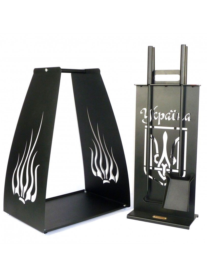 Набір для каміна «Україна» з корзиною для дров «Полум’я» - це комплексне рішення для стильного та зручного облаштування камінної зони. Поєднання функціонального камінного набору з місткою корзиною для дров дозволяє зберігати все необхідне в одному місці, підтримуючи порядок і естетику простору.