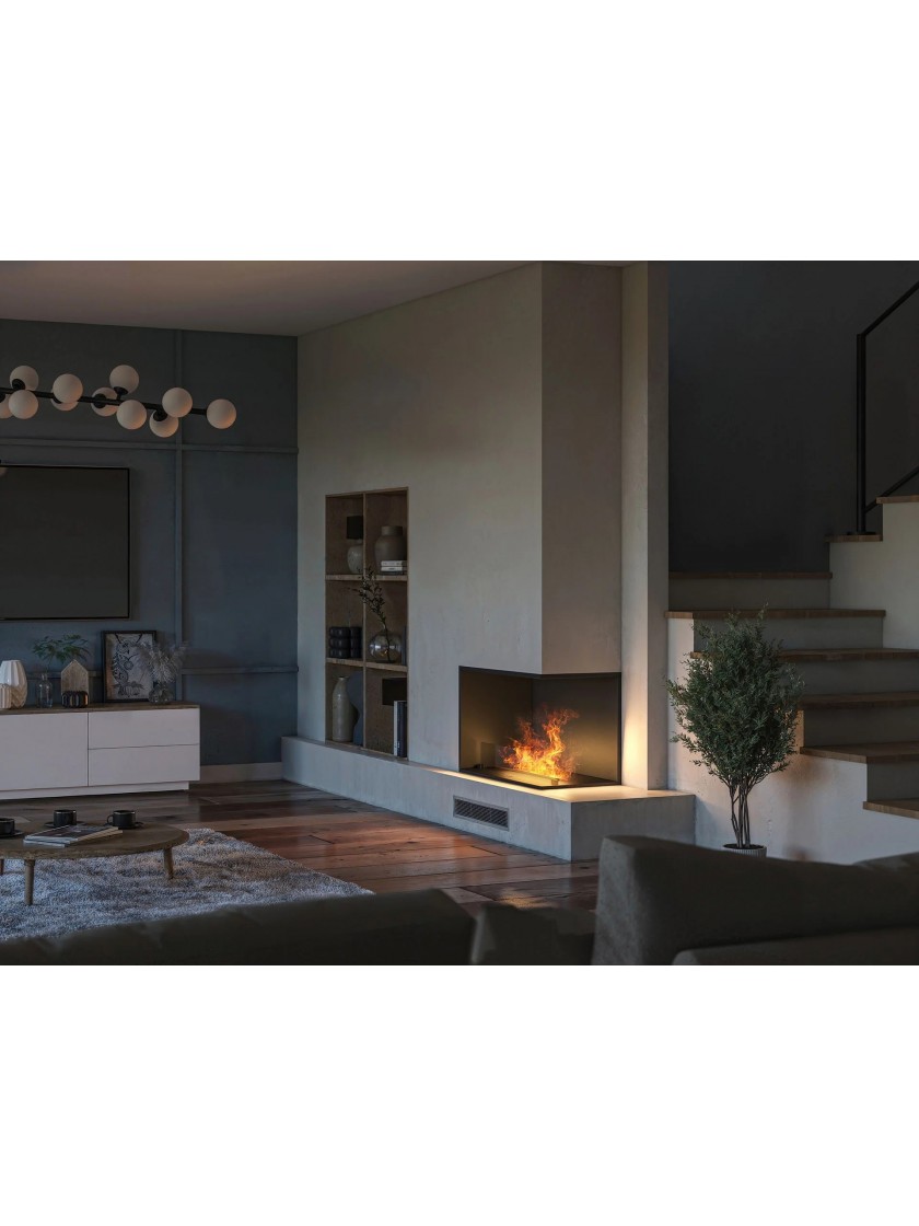 INVAPO INSIDE R800 – це кутовий паровий камін, доступний у  лівому або правому варіанті , який ідеально вписується в сучасні інтер'єри, особливо там, де традиційний фронтальний монтаж неможливий. Відкрита з двох сторін конструкція дозволяє милуватися ефектом вогню як спереду, так і збоку – ідеально доповнюючи кути.