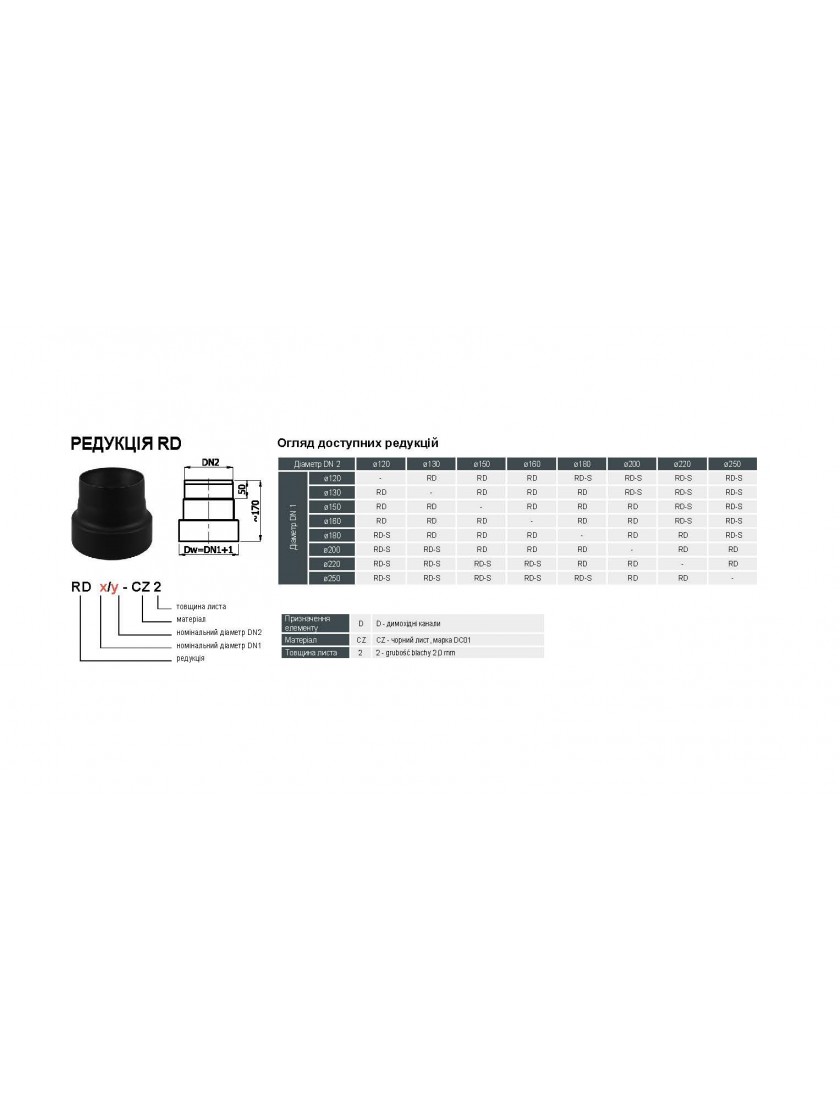 Редукція дозволяє з'єднати два елементи системи з різними діаметрами. Використовується як сполучний елемент для відведення відпрацьованих газів від камінів і твердопаливних опалювальних приладів, що працюють без конденсації. Покритий ззовні термостійкою фарбою Senotherm.
