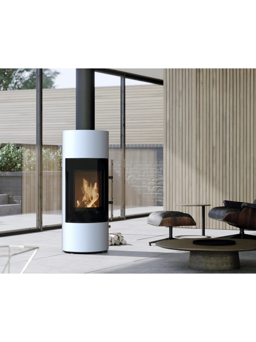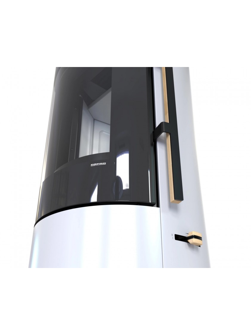 Піч з сучасною та елегантною конструкцією вражає напівкруглим склом дверцят, крізь яке полум’я видно у всій красі. Ефектні вигини на фронтальній частині утворюють витончену рамку навколо топки, надаючи виробу теплого й затишного характеру. Мінімалістичний, безрамковий корпус підкреслює сучасний стиль і функціональність моделі. Вертикальна ручка з дерев’яним оздобленням забезпечує зручне та герметичне зачинення дверцят завдяки системі засувки. Напівкругла топка гарантує не лише чудові параметри горіння, а й високу енергоефективність (клас A+). Компактні розміри та невелика потужність роблять цей опалювальний пристрій ідеальним вибором для енергоощадних будинків і осель з рекуперацією, особливо у поєднанні з системою Defro Air.
