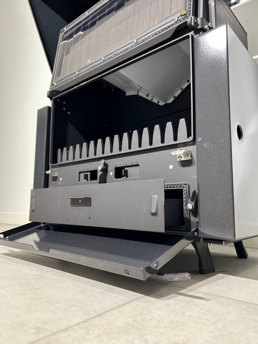 - Наявна бокова загрузка дров,