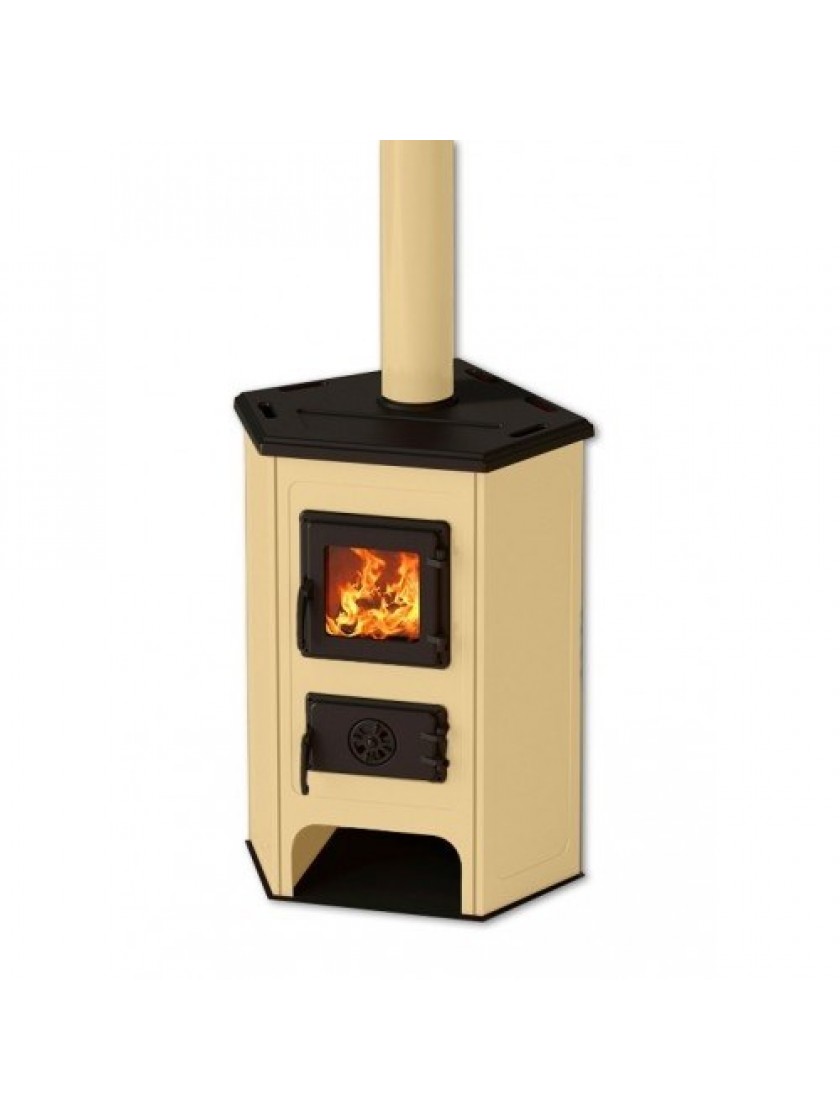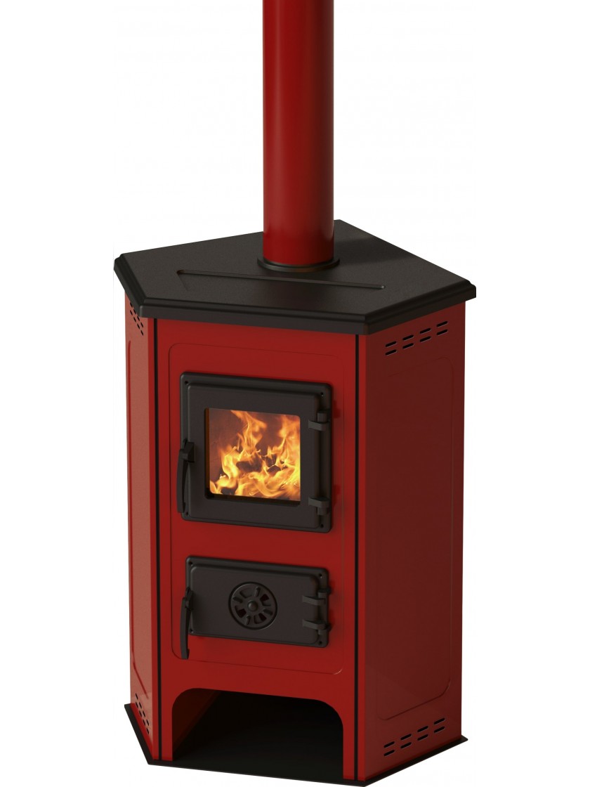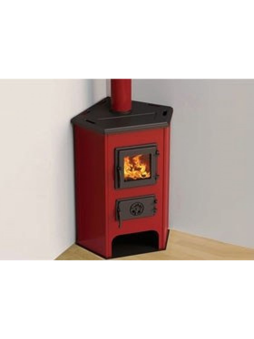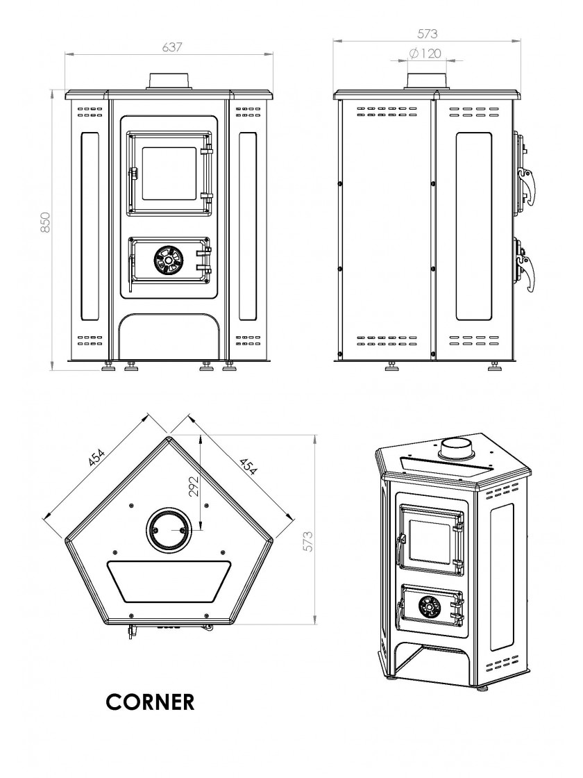 MBS Corner - кутова піч-камін тривалого горіння, призначена для обігріву приміщень площею 70-80 м². Двері багнисті і зольник зроблені з чавуну. Бічні стінки топки зроблені зі сталі і покриті емаллю. Піч включає дровницю для зберігання дров. Щоб не пошкодити поверхню, на якій буде стояти піч-камін, її ніжки прорезинені. Підключення димаря: верхнє, патрубок димаря кріпиться двома болтами і розташовується майже посередині верхньої кришки печі-каміна. Дверці багнисті і зольник зроблені з чавуну, а також має високоякісне термоскло німецького виробництва.