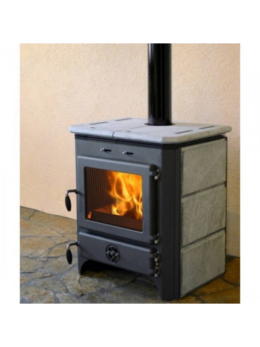- Чавунні дверці і оздоблення натуральним каменем;
