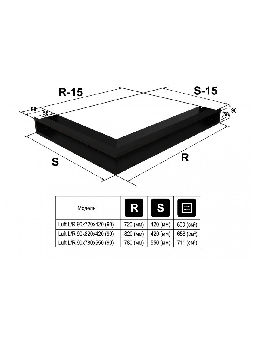 Вентиляційна решітка Ferrum Luft кутова ліва чорна 90х720х420 (90) – естетичне закінчення каналів, які розподіляють тепле повітря від каміну.